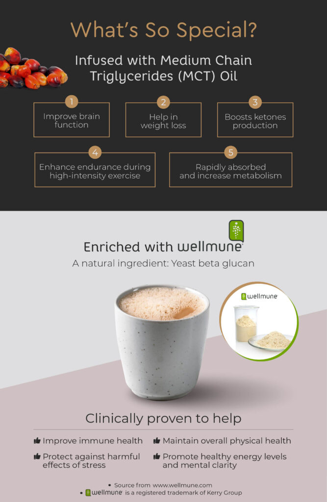 A keto-friendly, convenient sachet-based coffee series that can both serve as a drink or a meal replacement. With a GI of 35, our Bulletproof Coffee contains pure MCT oil powder, fibre and Wellmune® for optimal health. It is available in four delicious flavours: Original, Hazelnut, Peppermint, and Caramel.